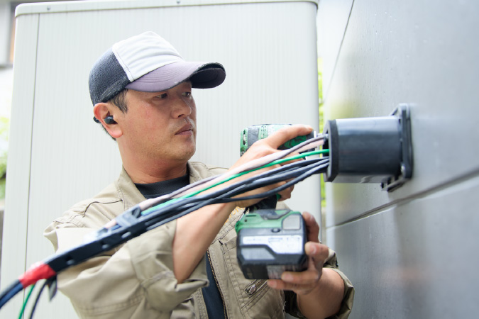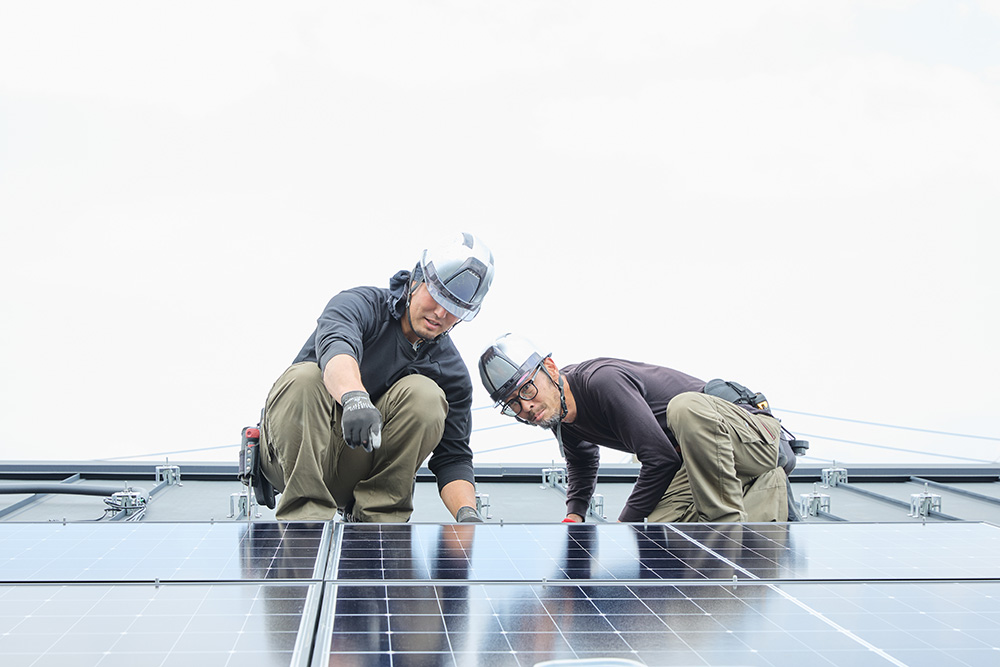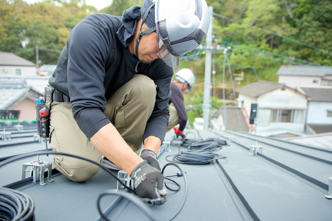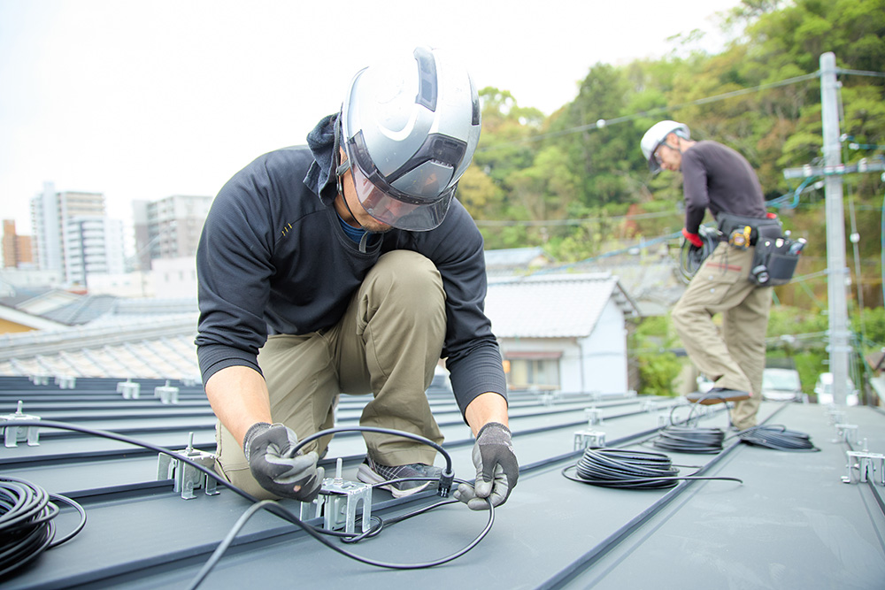 施工技術の向上につながる電気工事の技術を向上させる秘訣。それは「ものづくりを楽しむ心」だと考えています。太陽光発電やエコキュートは、ご家庭にとってなくてはならない電気設備・機器であり、技術が低ければお客さまの生活に迷惑がかかります。また、屋根の上にパネルを設置する太陽光発電工事は危険も伴う真剣勝負です。集中力が求められる仕事ですが、「より良い工事をしよう」という向上心・ものづくりへのこだわりを持って取り組み、良い工事ができたときの達成感は格別です。