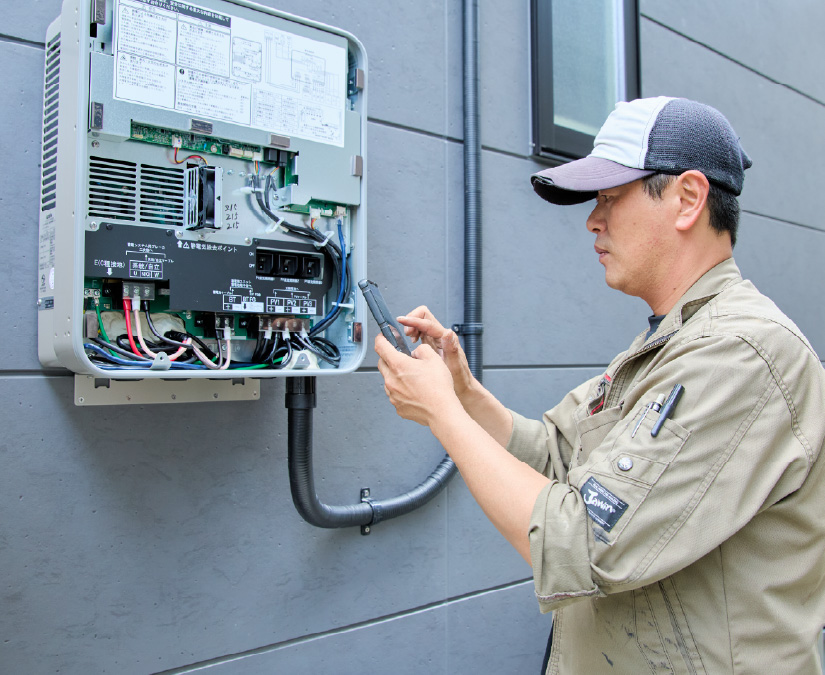 1現場調査 太陽光パネルやエコキュートの設置場所を確認し、電気系統を調査して工事の下見を行います。