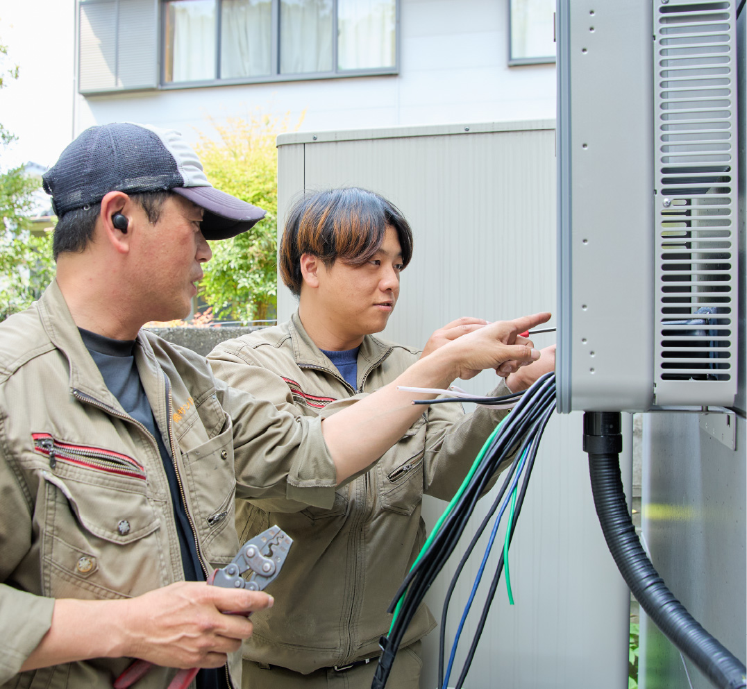 小さなこと、カンタンなことから一つずつ、先輩社員から学んでいきます。サンハートの仕事には、マニュアルがありません。電気工事士の業務には、当然ルールや正しいやり方はありますが、太陽光発電やエコキュートは、メーカーごとに仕様が異なりますし、何よりお客さまの住居は1軒1軒すべて違いますので、現場で経験を積むことが何より必要です。